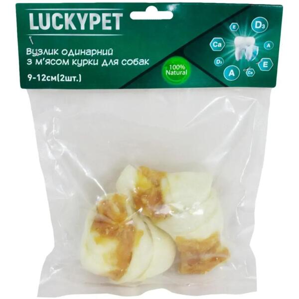 Домашні улюбленці будуть раді, якщо ви їх побалуєте корисними ласощами від торгової марки Lucky Pet, які зазвичай використовують як заохочення або нагороду, для поліпшення здоров'я зубів і ясен, або просто для задоволення їх потреб в жуванні і перекусі. Має природний смак, що робить споживання цього продукту більш насиченим і поживним. Форма вузлика з м'ясом курки є універсальною для всіх порід собак і всіх темпераментів з підвищеним рівнем смаку для найвибагливіших тварин. Вузлик надає можливість чистити зуби і ікла, одночасно є стимулятором цікавості. Така форма рекомендована для всіх порід собак. Рекомендується використовувати трубочку товщиною в пів пащі собаки, це забезпечує оптимальну відповідність розміру і форми потребам кожної тварини. З додаванням екстракту спіруліни. Не містить барвників, цукру і глютену. Без ГМО.