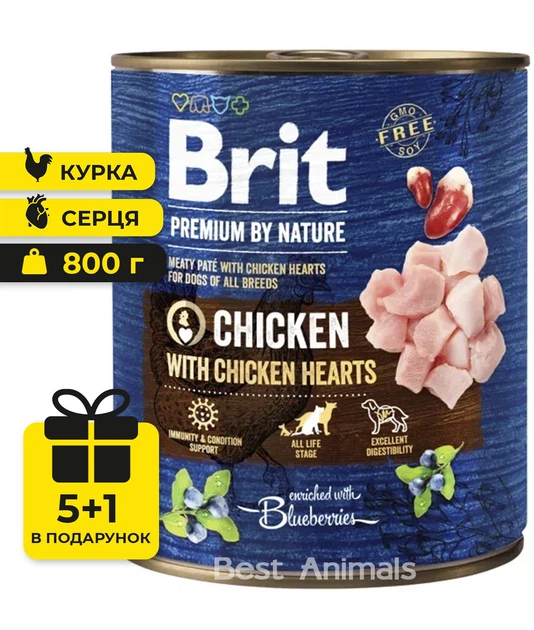 Вологий корм з куркою та курячими серцями Brit Premium Chicken with Chicken Hearts консерва для собак 800 г 5+1 шт (85956025