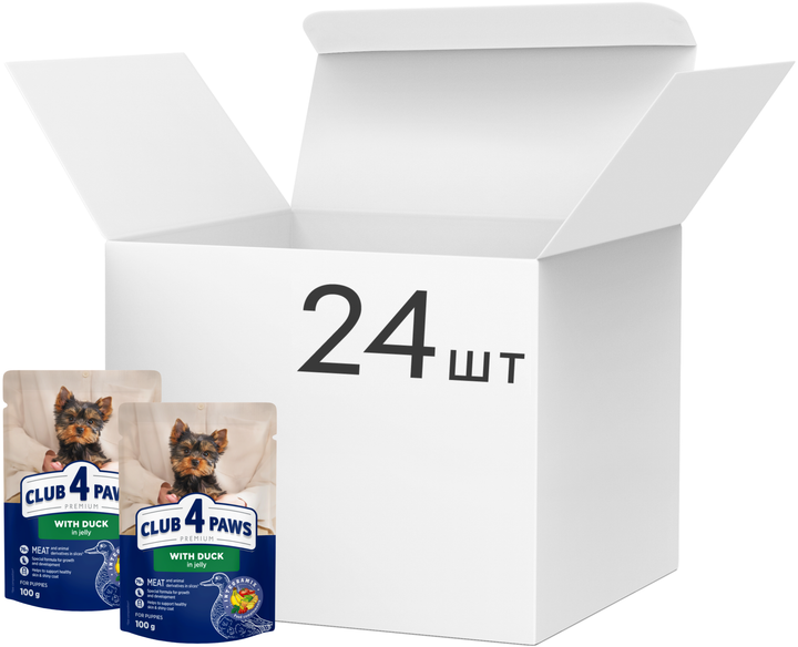 Упаковка вологого корму для цуценят мініатюрних та малих порід Club 4 Paws Преміум Шматочки з качкою в желе 0.1 кг х 24 шт (