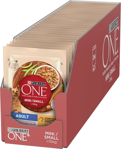 Упаковка вологого корму для собак Purina One Mini/Small шматочки в соусі з куркою, морквою та зеленою квасолею 26 шт по 85 г