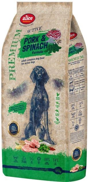 Сухий корм для собак Alice PREMIUM Active (Professional Pork & Spinach) зі свининою та шпинатом 17 кг