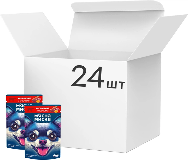 Упаковка вологого корму дорослих собак М'ясна Миска шматочки в соусі з яловичиною та овочами 100 г x 24 шт (4820255194806)