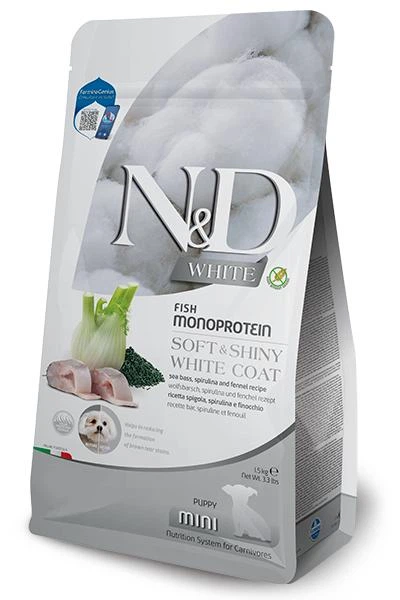 Беззерновий сухий корм Farmina N&D White Puppy Mini для цуценят малих порід з білою шерстю, з сибасом, спіруліною та фенхеле