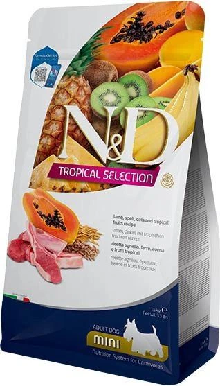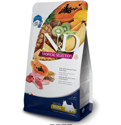 Сухий низькозерновий корм Farmina N&D TROPICAL SELECTION для дорослих собак дрібних порід з ягням та тропічними фруктами, 1.