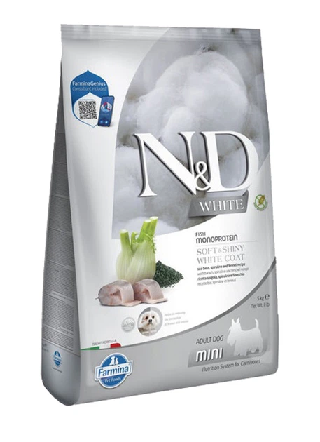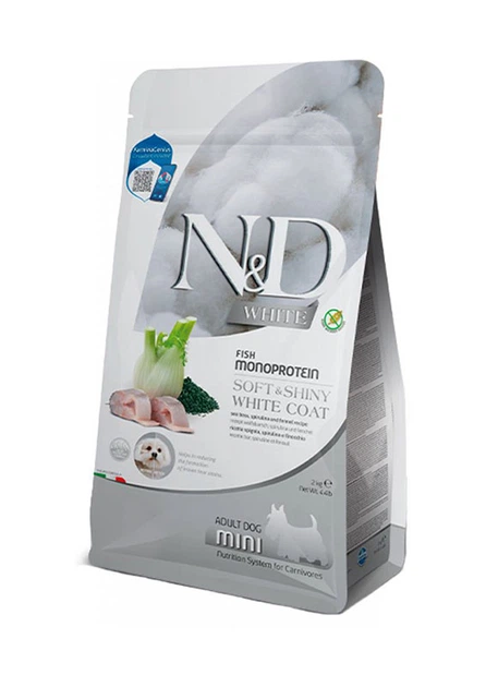 Беззерновий сухий корм Farmina N&D White Adult Mini для собак дрібних порід з білою шерстю, з сибасом, спіруліною та фенхеле