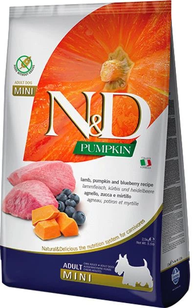 Беззерновий сухий корм для собак дрібних порід Farmina N&D Grain Free PUMPKIN LAMB & BLUEBERRY ADULT MINI з гарбузом, ягням,