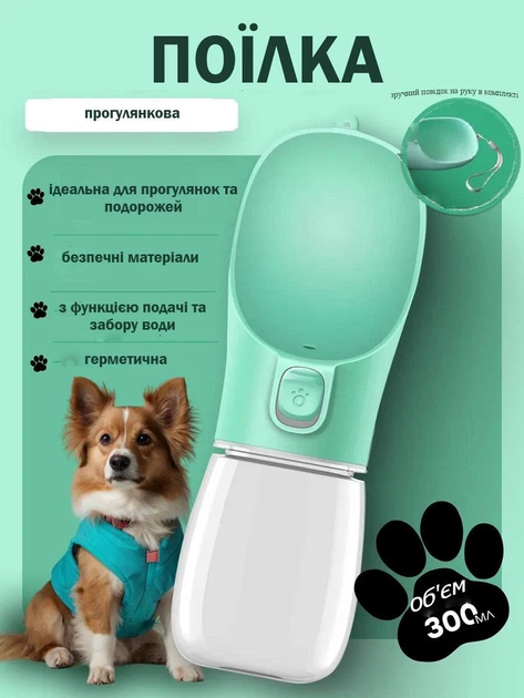 Дорожня пляшка для тварин, портативна поїлка для собак і котів 300мл Бірюзова