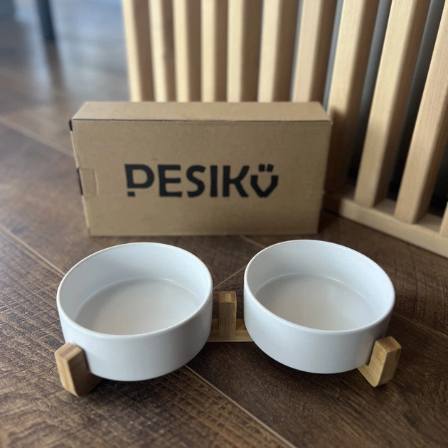 Керамічна подвійна миска на бамбуковій підставці для собак та котів. Біла