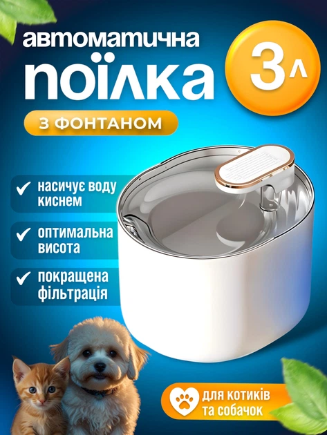 Автоматична поїлка-фонтан для котів і собак 3 л з фільтром і USB живленням