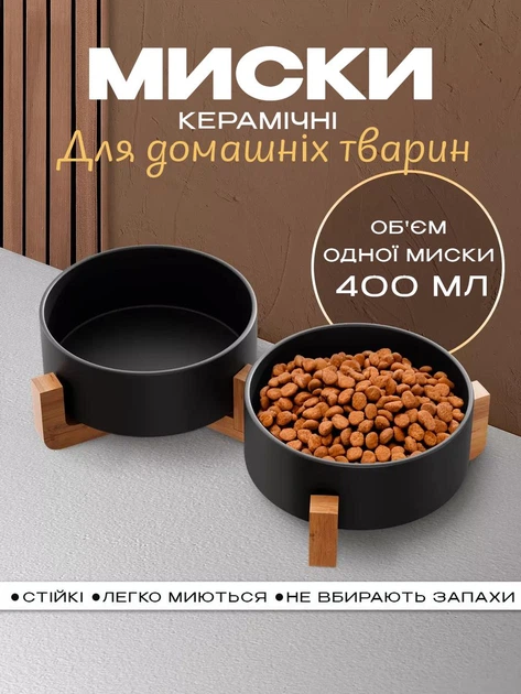 Керамічні миски для котів собак і великих гризунів подвійні на дерев'яній підставці 400 мл Чорні (CPM-002)