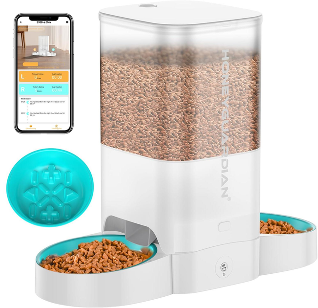 Автоматична годівниця для кішок і собак HONEYGUARIDAN S305D 5L WIFI на 2 миски, з мискою-лабіринт, Білий (196A-WHITE)