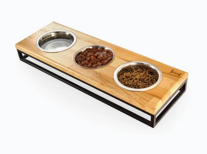 Три миски на підставці Harley and Cho Lunch Bar Natural wood + Black S 54x18x7cm / Миски по 0,45л Натуральний + чорний
