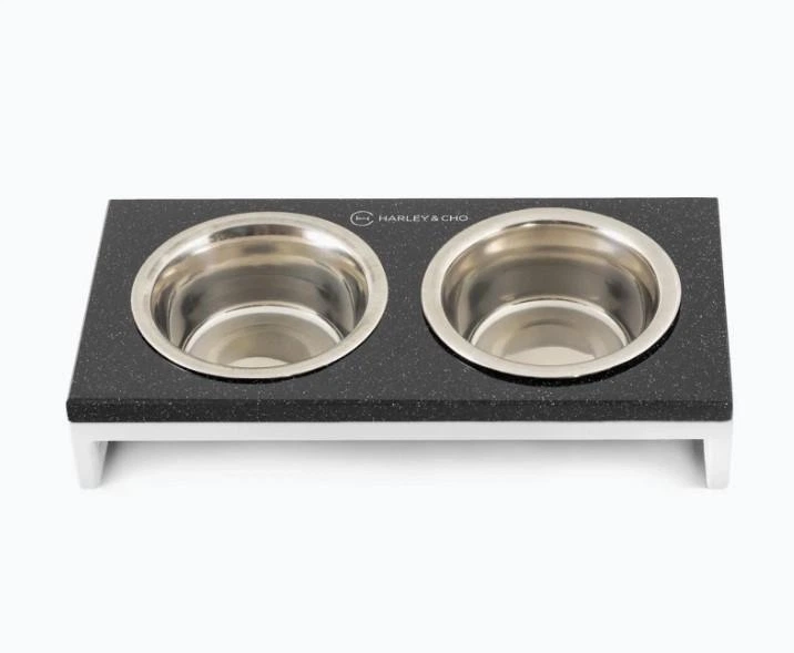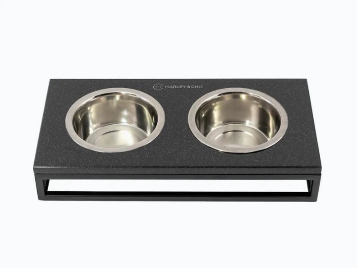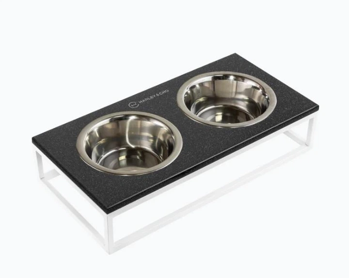 Миски на підставці Harley and Cho Lunch Bar Black Stone + White XS 28x14x5cm / Миски по 0,2л Чорний камінь білий метал