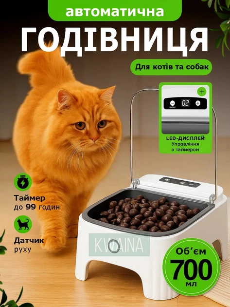 Автоматична смарт-годівниця для котів та собак, з таймером, датчиком руху, 700 мл, акумулятор 2000 мАг, біла