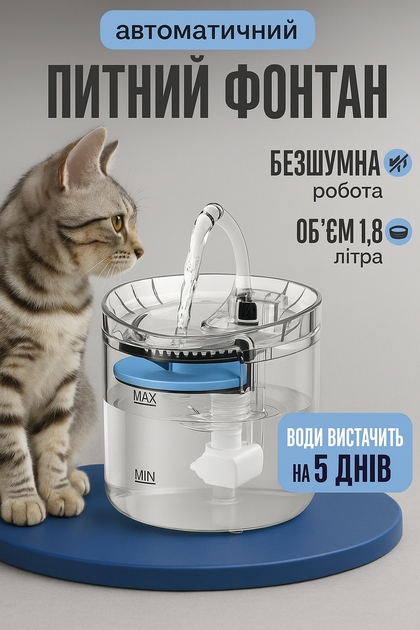 Прозора автопоїлка-фонтан для тварин, 1.8 л / Безшумна робота, 3-ступенева фільтрація