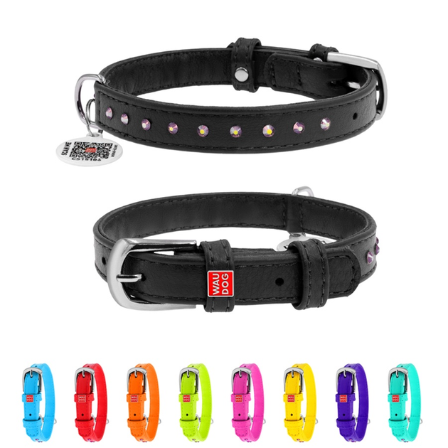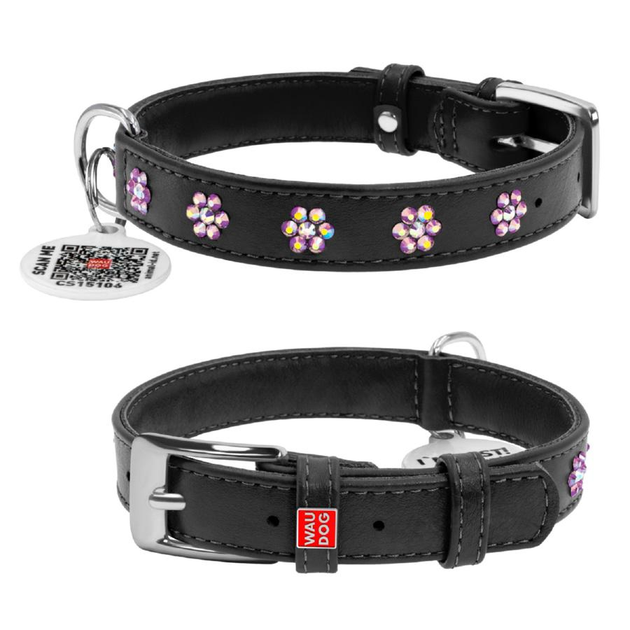 Нашийник для собак шкіряний WAUDOG Glamour з QR паспортом, з клейовими стразами, Ш 15 мм, Дл 27-36 см, чорний