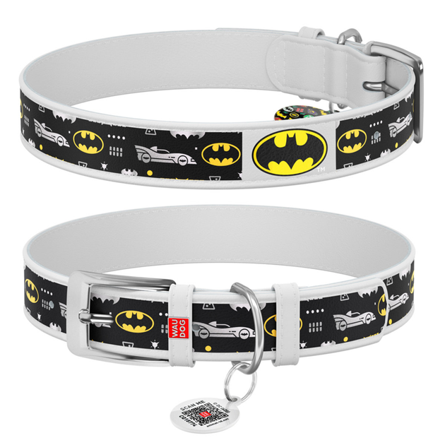 Нашийник для собак шкіряний WAUDOG Design з QR паспортом, малюнок "Бетмен3", Ш 25 мм, Дов 38-49 см (білий)