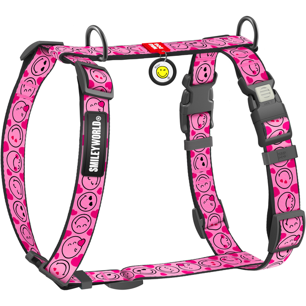 Шлея для собак анатомічна H-подібна WAUDOG Nylon з QR паспортом, малюнок "Смайли на рожевому", з двома фастексами, розмір L
