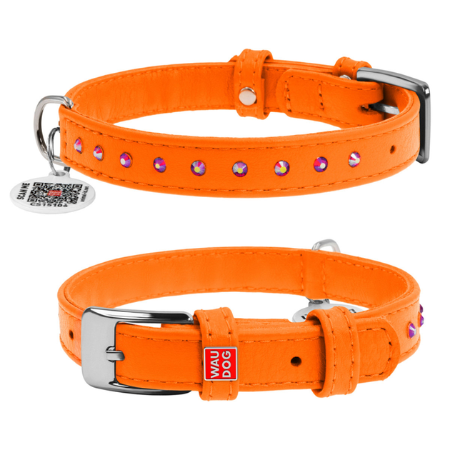 Нашийник для собак шкіряний WAUDOG Glamour з QR паспортом, з клейовими стразами, Ш 15 мм, Дл 27-36 см, оранжевий