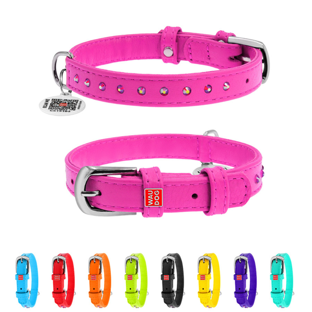 Нашийник для собак шкіряний WAUDOG Glamour з QR паспортом, з клейовими стразами, Ш 15 мм, Дов 27-36 см рожевий