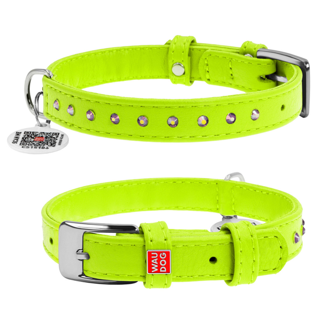 Нашийник для собак шкіряний WAUDOG Glamour з QR паспортом, з клейовими стразами, Ш 15 мм, Дов 27-36 см салатовий