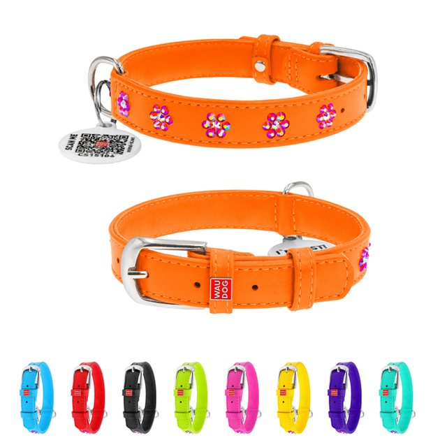 Нашийник для собак шкіряний WAUDOG Glamour з QR паспортом, з клейовими стразами Квіточка, Ш 20 мм, Д 30-39 см, оранжевий