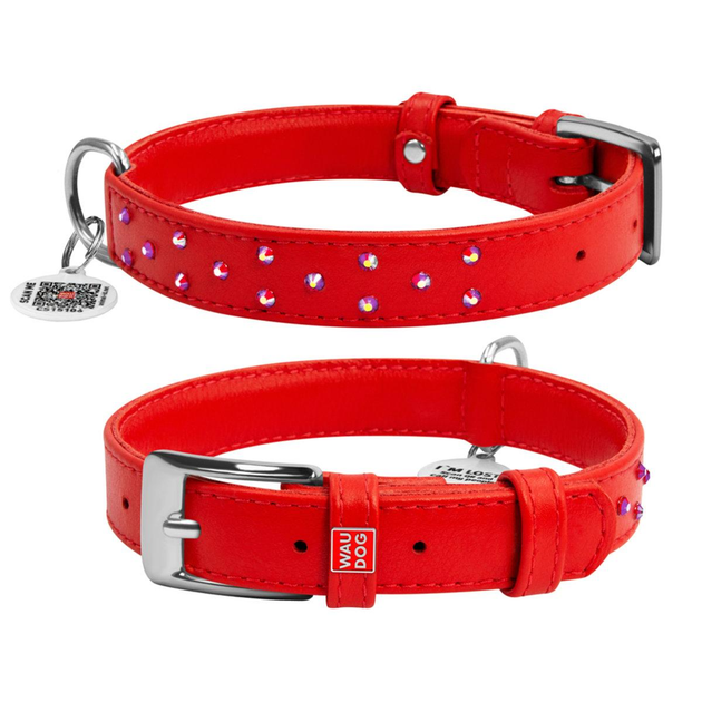 Нашийник для собак шкіряний WAUDOG Glamour з QR паспортом, з клейовими стразами, Ш 25 мм, Дов 38-49 см червоний