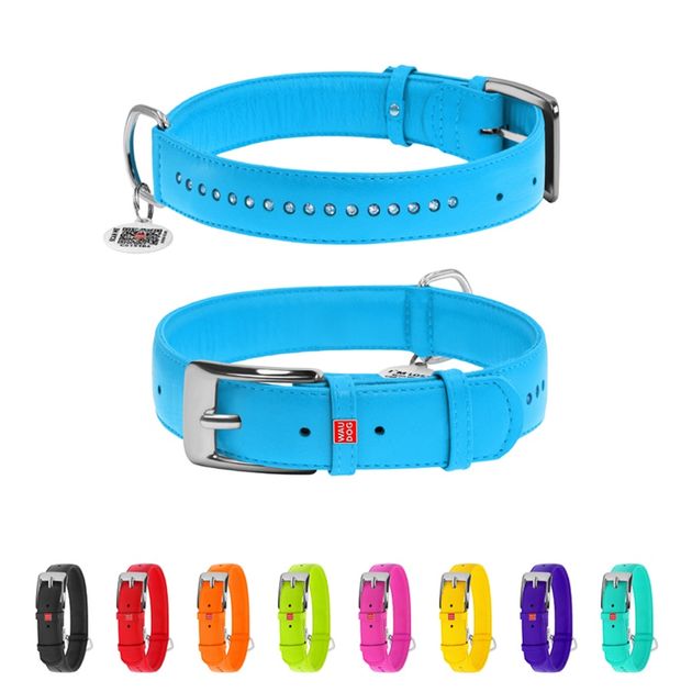 Нашийник для собак шкіряний WAUDOG Glamour з QR паспортом, подвійний зі стразами, XL, Ш 35 мм, Дов 46-60 см блакитний