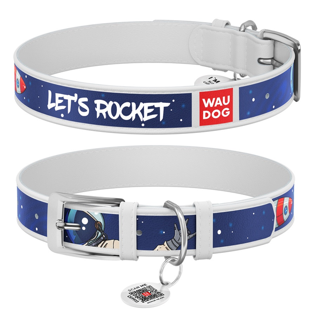 Шкіряний нашийник для собак WAUDOG Design з QR паспортом малюнок Космос. Ракета XL Ш 35 мм 46-60 см White (0035-0125-15)