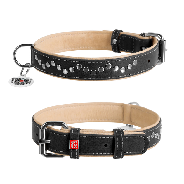 Шкіряний нашийник для собак WAUDOG Soft з QR паспортом металеві прикраси Ш 25 мм Д 38-49 см Black (7206)
