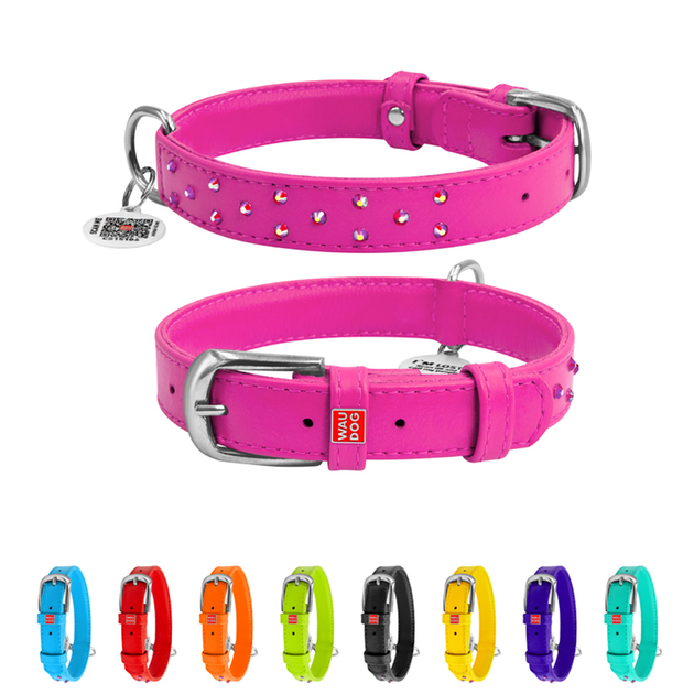 Нашийник для собак шкіряний WAUDOG Glamour з QR паспортом, з клейовими стразами, Ш 25 мм, Дов 38-49 см рожевий