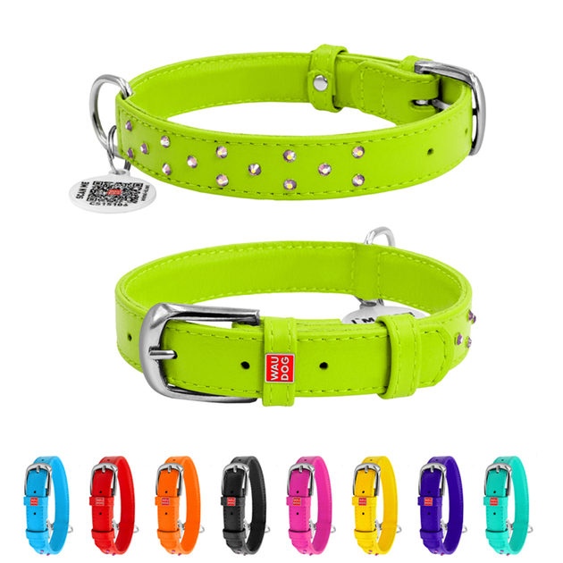 Нашийник для собак шкіряний WAUDOG Glamour з QR паспортом, з клейовими стразами, Ш 20 мм, Дов 30-39 см салатовий