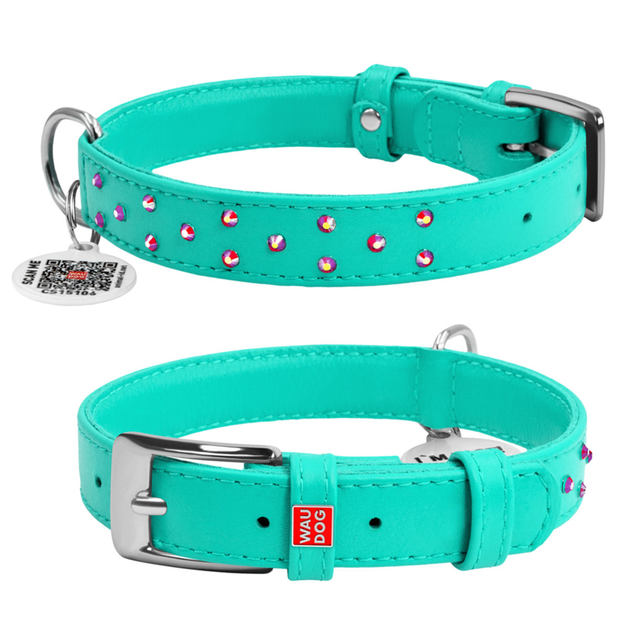 Ошейник для собак шкіряний WAUDOG Glamour з QR паспортом, з клейовими стразами, Ш 20 мм, Дов 30-39 см ментоловий