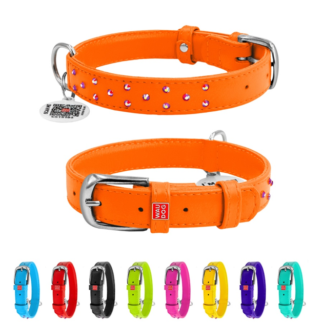 Нашийник для собак шкіряний WAUDOG Glamour з QR паспортом, з клейовими стразами, Ш 20 мм, Дов 30-39 см помаранчевий