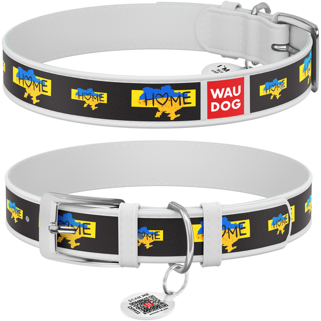 Нашийник для собак шкіряний WAUDOG Design з QR паспортом, малюнок "Прапор", XL, Ш 35 мм, Дов 46-59 см, білий