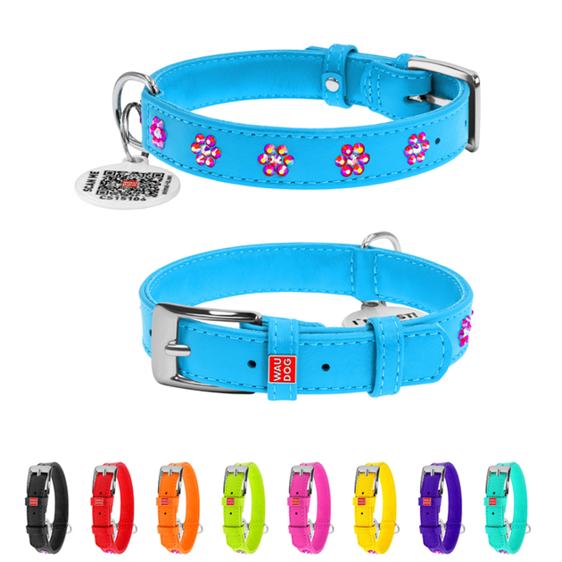 Нашийник для собак шкіряний WAUDOG Glamour з QR паспортом, з клейовими стразами Квіточка, Ш 15 мм, Д 27-36 см, блакитний