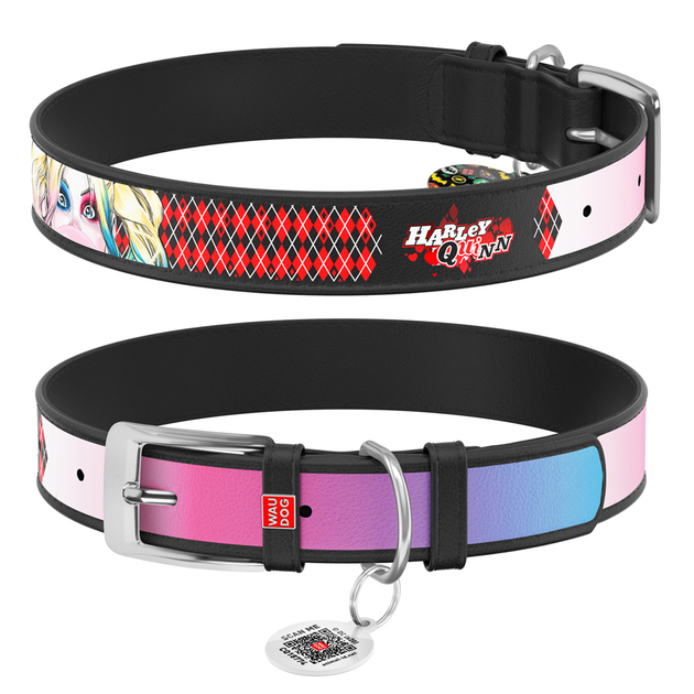 Нашийник для собак шкіряний WAUDOG Design з QR паспортом, Харлі Квін, Ш 35 мм, Д 46-59 см, чорний