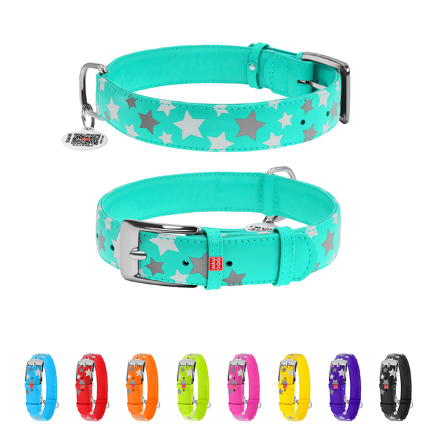 Нашийник для собак WAUDOG шкіряний Glamour з QR паспортом, візерунок Зірочка, що світиться/світловідбиваючий, XL, Ш 35 мм, Д