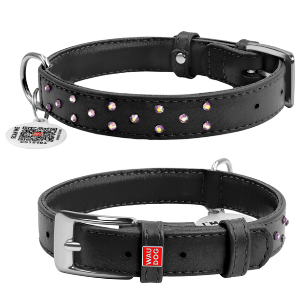 Нашийник для собак шкіряний WAUDOG Glamour з QR паспортом, з клейовими стразами, Ш 20 мм, Дл 30-39 см, чорний