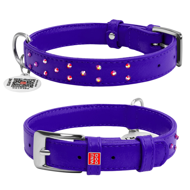 Нашийник для собак шкіряний WAUDOG Glamour з QR паспортом, з клейовими стразами, Ш 20 мм, Дов 30-39 см фіолетовий
