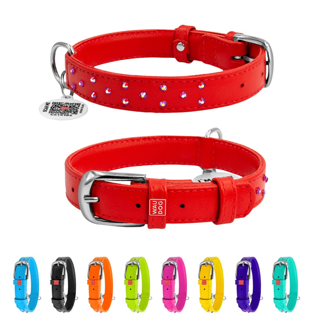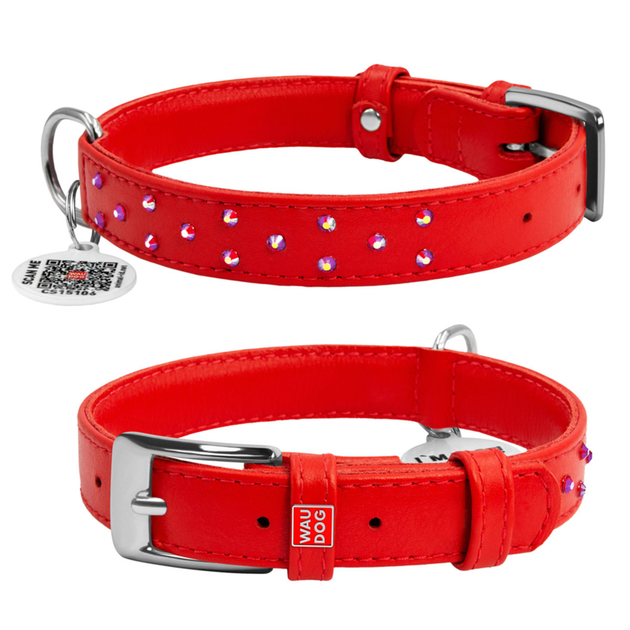 Нашийник для собак шкіряний WAUDOG Glamour з QR паспортом, з клейовими стразами, Ш 20 мм, Дов 30-39 см червоний