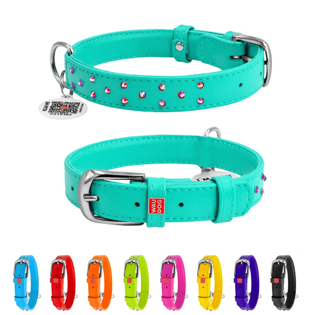 Нашийник для собак шкіряний WAUDOG Glamour з QR паспортом, з клейовими стразами, Ш 20 мм, Дл 30-39 см, ментоловий
