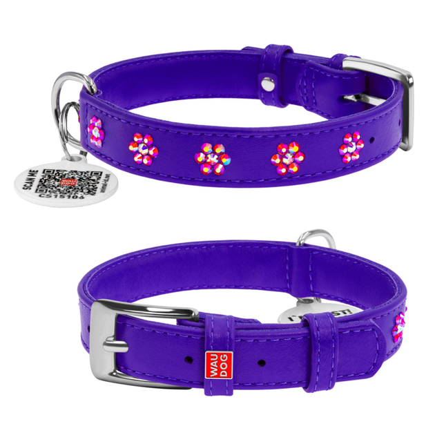 Нашийник для собак шкіряний WAUDOG Glamour з QR паспортом, з клейовими стразами "Квіти", Ш 20 мм, Дов 30-39 см фіолетовий