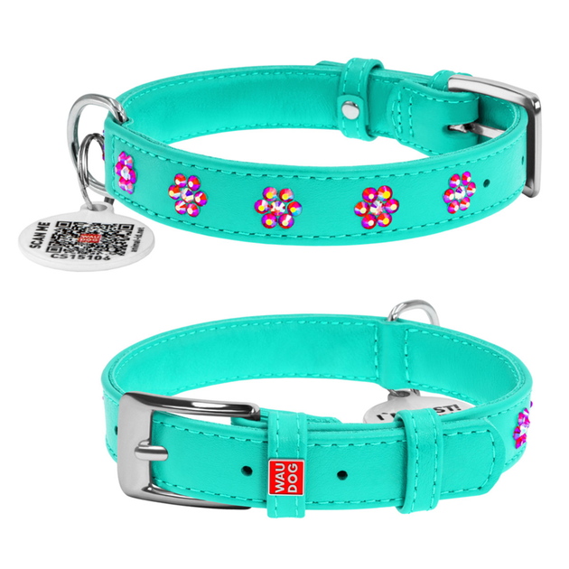 Нашийник для собак шкіряний WAUDOG Glamour з QR паспортом, з клейовими стразами "Квіти", Ш 20 мм, Дов 30-39 см (блакитний)