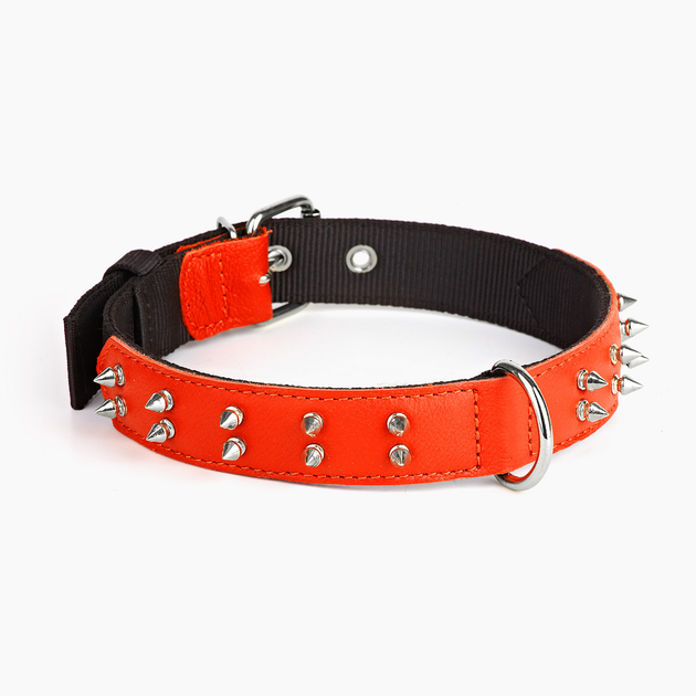 Нашийник KareLine з нейлону і натуральної шкіри з шипами 35 мм 410-510 мм Помаранчевий