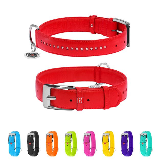 Нашийник для собак шкіряний WAUDOG Glamour з QR паспортом, подвійний зі стразами, M, Ш 20 мм, Д 30-39 см, червоний