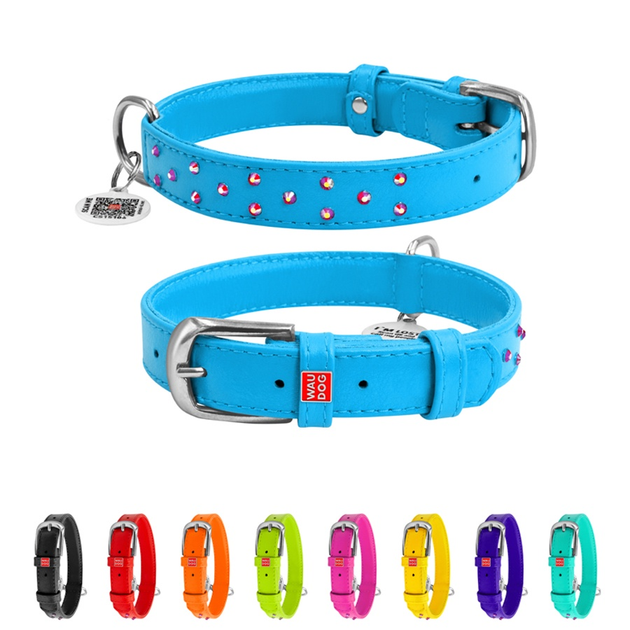 Нашийник для собак шкіряний WAUDOG Glamour з QR паспортом, з клейовими стразами, Ш 25 мм, Дов 38-49 см блакитний