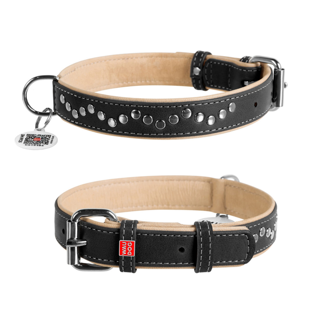Амуніція Collar WAUDOG Soft Нашийник для собак шкіряний з QR паспортом, металічні прикраси, чорний L (z7206)