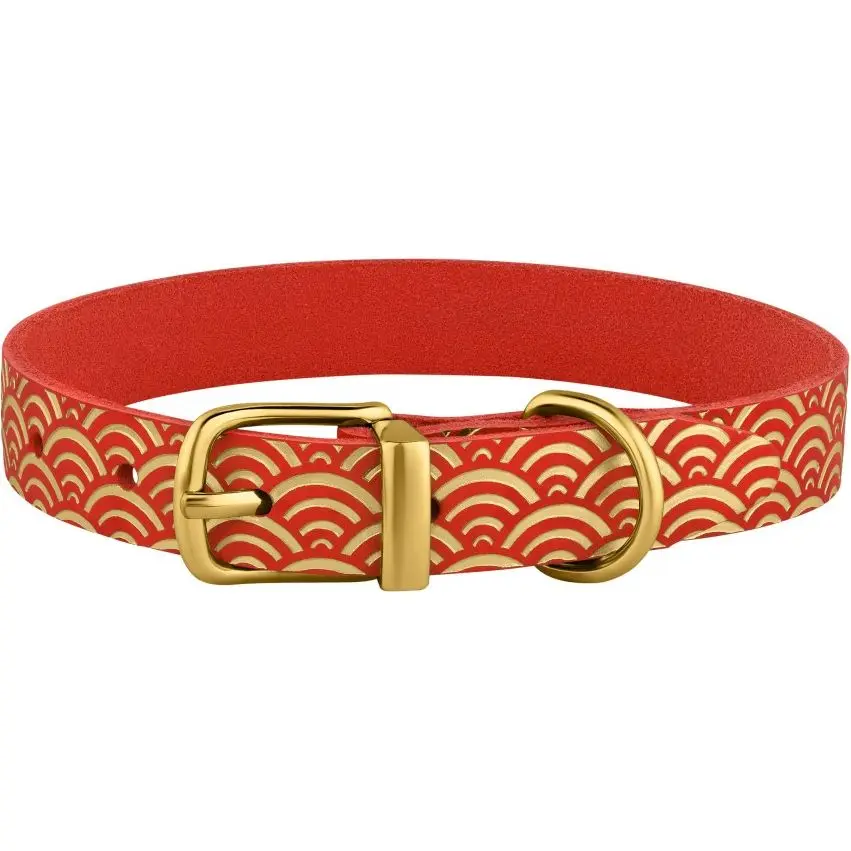 Нашийник для собак BronzeDog Barksi Classic Хвиля шкіряний одинарний із золотим тисненням 18-25х1 см червоний