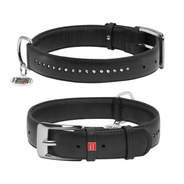 Нашийник для собак шкіряний WAUDOG Glamour з QR паспортом, подвійний зі стразами, L, Ш 25 мм, Дов 38-49 см чорний